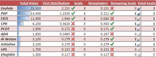 A potential result of this is that every district will elect a large number of parties, with very few getting more than one seat. The polling that was done prior to the survey blackout showed that voters had little enthusiasm for any particular party. Enadha, a “moderate” Islamist party was receiving the most support, with around 20% of Tunisians planning on supporting them. In contrast, one poll placed those who support no party at 40%. I made a very crude estimate of a hypothetical vote distribution by taking the average of the two most recent polls (the only two I found that were conducted in September). The problem with this is there are still a fair number of undecided that I can’t place anywhere. While it’s very possible many of these undecideds will stay home on Election Day, many will probably vote for one of the main parties. Having so little knowledge of where they will go means we have to take this for what it is. The diagram below shows how each party would fair in a district with nine seats. I used 100,000 voters and awarded seats based on party performance from the last two polls.