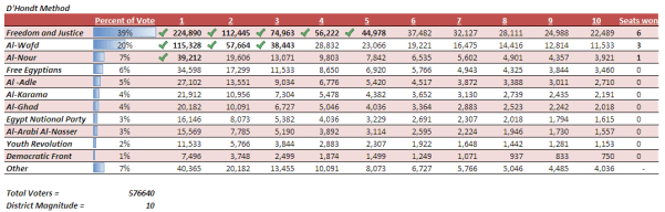 It should also be noted that this method would favor Freedom and Justice even more in smaller Egyptian districts. Under the D’Hondt method, a decrease in districts magnitude can decrease the number of parties who win a seat. If, for example, this was a rural district in Masa Matruh Governorate, with four seats, then Freedom and Justice would get three seats and Wafd one.