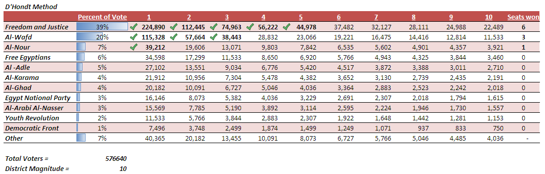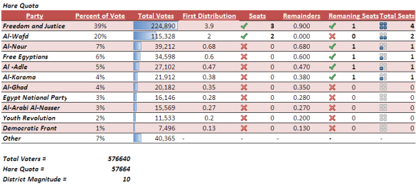 Freedom and Justice gets four seats, Al-Wafd gets two, and the remaining four seats go to the next four parties. Note that in this scenario, Freedom and Justice isn’t being specifically disadvantaged; they are actually receiving the number of seats they deserve. It’s just that smaller parties, are getting more seats than we would expect if the system was perfectly proportional.