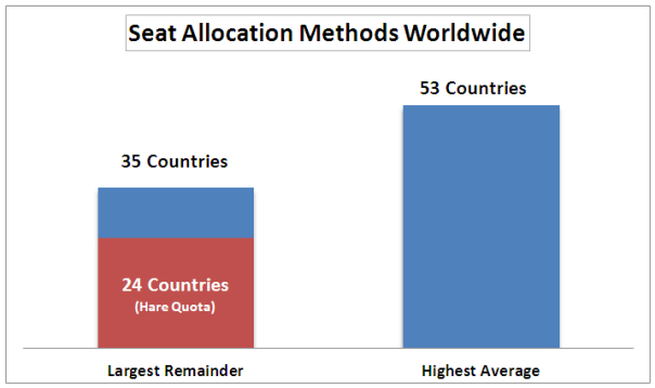 For the upcoming elections, it appears Egypt will use a Hare quota. Despite its recent use in Tunisia, the Hare quota is a somewhat unpopular method. Figure one shows that the largest remainder method, and the Hare quota specifically, isn’t nearly as common as the highest average method of seat allocation. I bring this up because it’s notable the government chose a less common system.