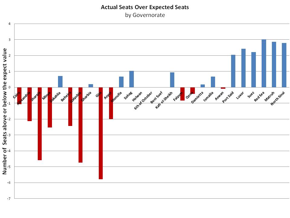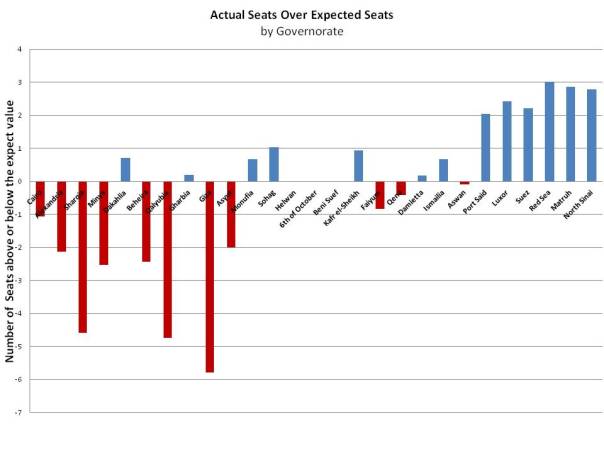Figure two (click to enlarge) does a better job of showing which governorates received more or less seats than they would have if seats were perfectly distributed. Giza comes out pretty poorly, being underrepresented by almost six seats, followed by Qalyubia and Shariqia. At first glance this looks like a wide disparity, but in reality I think this isn’t too bad. The fact that the chart is compressed (so it was easier to read) gives the impression that there is a lot of range, but most governorates fall between one and two seats outside of their expected level. It is notable, however, that with few exceptions, higher population areas do worse than low ones. The governorates in the chart are ordered from highest population to lowest, so we can see a pretty obvious bias towards the right side.