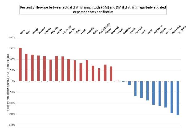 Next, we can look at how proportional each governorate is. I’m aware of some proportionality indices, but they only work if we have party votes. (If anybody knows a good way to measure without this information, please let me know). So absent this information, I tried another idea. I took the the percentage difference between district magnitude if the 252 PR seats were perfectly distributed, and the actual average district magnitude in each governorate. So, for example, if seats were distributed perfectly by population, Cairo would receive 29 seats. Then the most proportional distribution would be for all of it’s 8,968,694 residents to vote in one district with 29 seats. In reality, however, the average district magnitude is 4, with each one having 2,242,181 residents in it. Comparing the percentage difference of these numbers across governorates should allow us to view how proportional each region is in comparison to each other. Figure three shows there is once again a pattern; large population governorates are the least proportional while small ones are more so. Lines in red have an actual district magnitude lower than the expected value, while blue lines have a DM that is actually higher than we would expect. This pattern isn’t terribly surprising and should be expected when you hold the district magnitude constant across all regions, regardless of population.