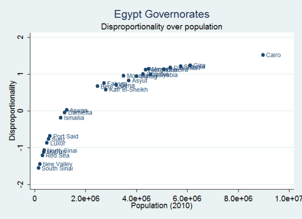 Cairo stands out as the least proportional governorate; its average DM of four means there are 1,933,549 more people per district than there would be if the governorate had a district magnitude of 29. (A 152% difference in actual district magnitude). Figure four shows the relationship between population and this measure of disproportionality.