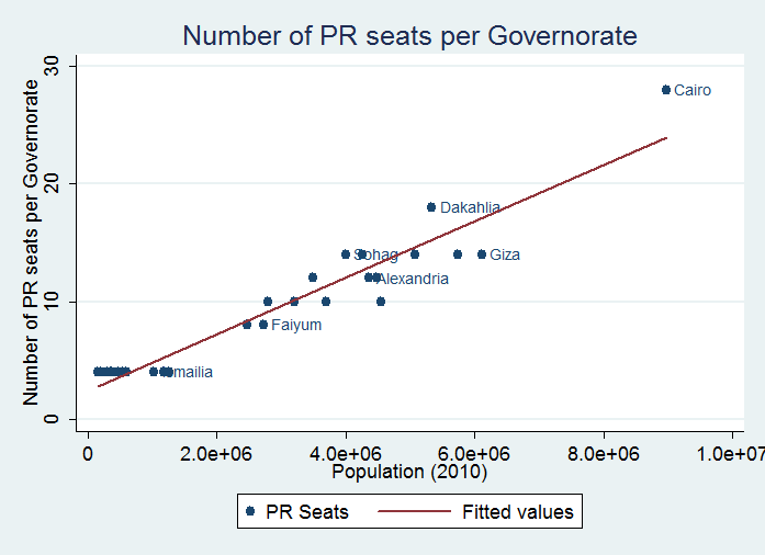 Figure one shows that the population of a governorate and the number of PR seats it was awarded are largely related. The regression has an R squared score of .9178.